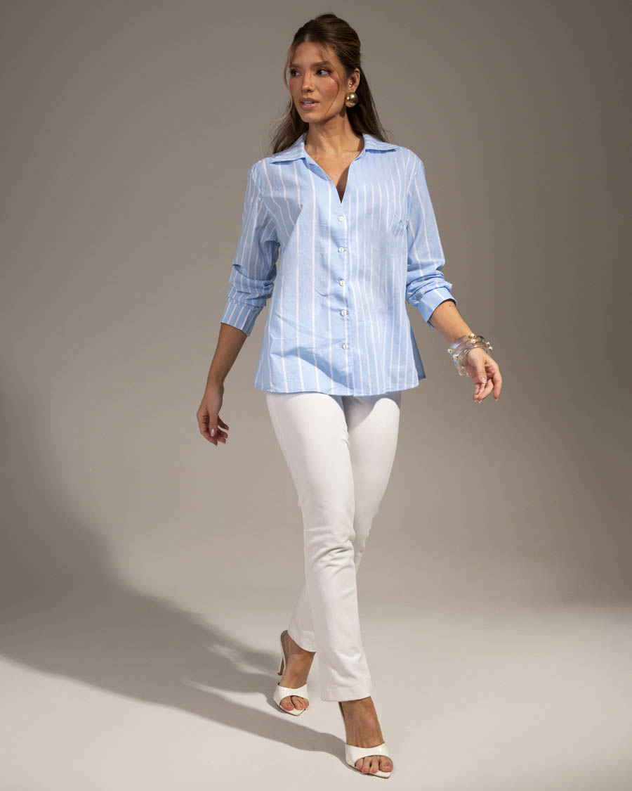 O modelo possui manga 3/4 com possibilidade de dobra, gola clássica e fechamento frontal por botões, garantindo praticidade e um caimento impecável. Sua modelagem levemente soltinha proporciona conforto sem abrir mão da elegância.