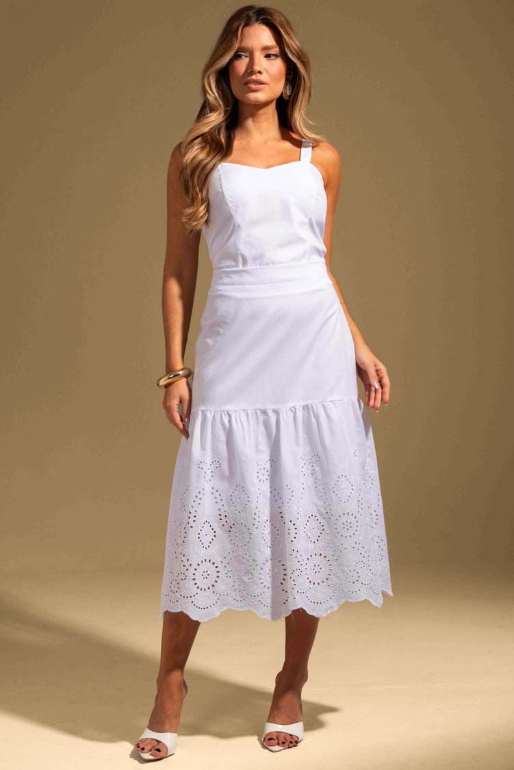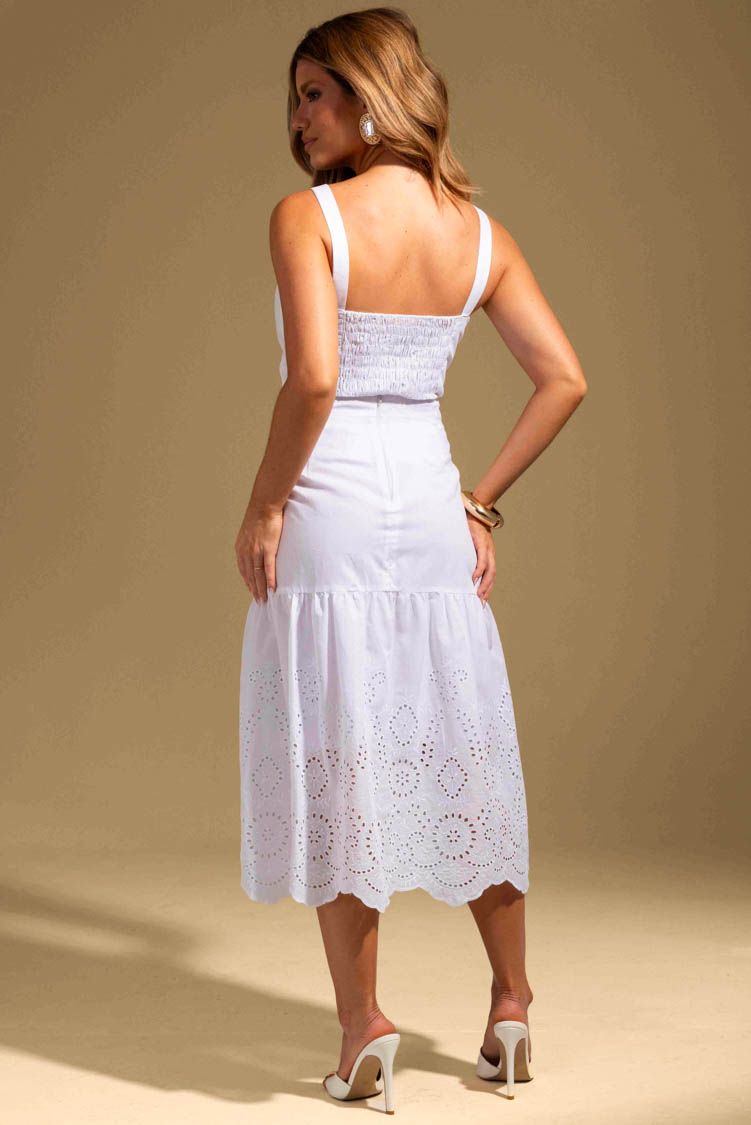 A blusa possui alças e lastex nas costas, garantindo conforto e um ajuste perfeito ao corpo. A saia midi tem caimento fluido, com recortes que valorizam a silhueta e acabamento em barra bordada, trazendo ainda mais charme e sofisticação à peça.