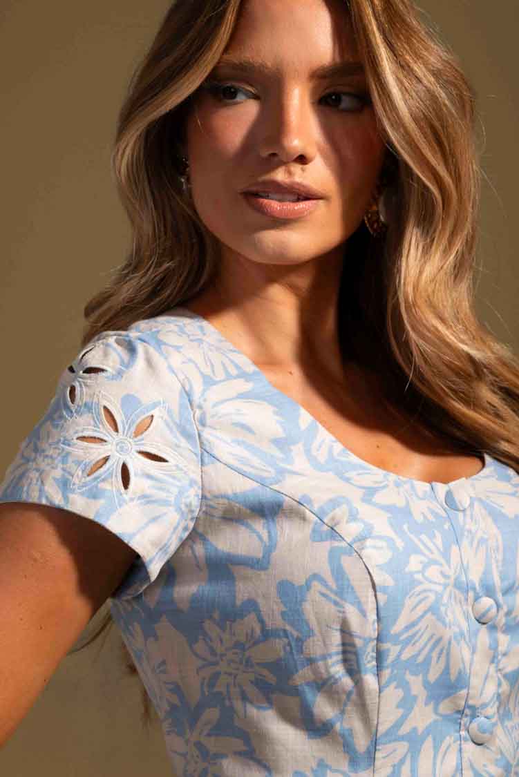 As mangas com bordados Richelieu acrescentam um toque artesanal e feminino à peça, enquanto os recortes na modelagem garantem um caimento elegante e estruturado.