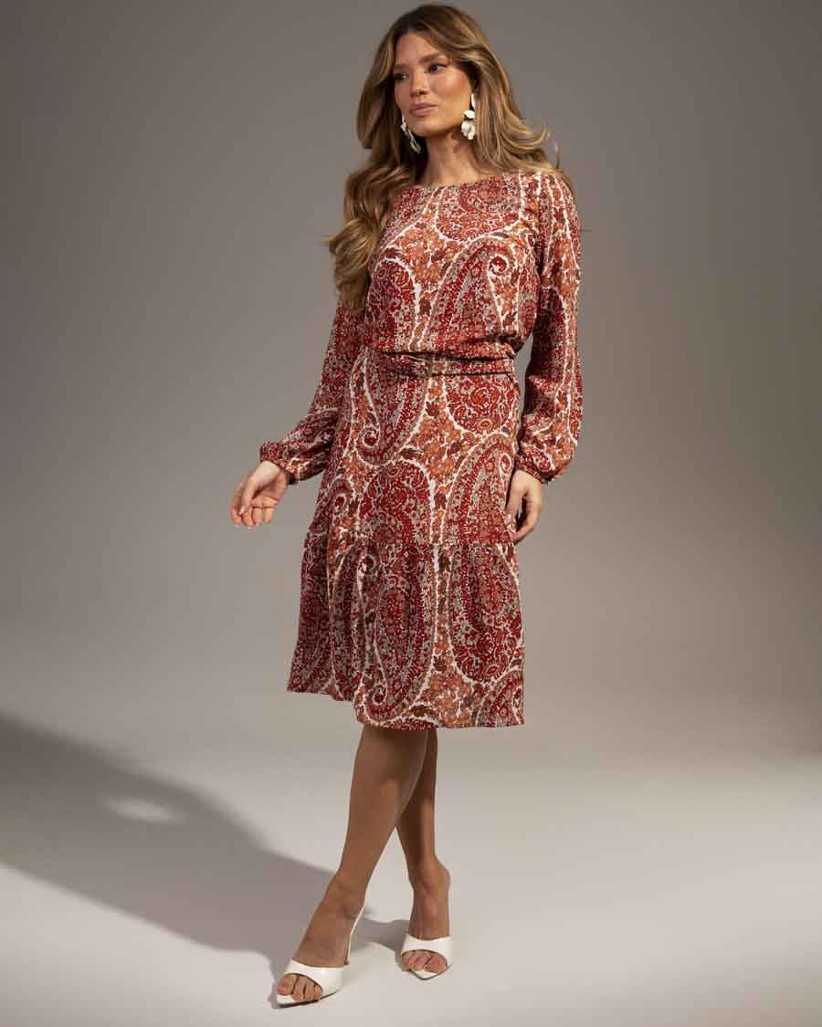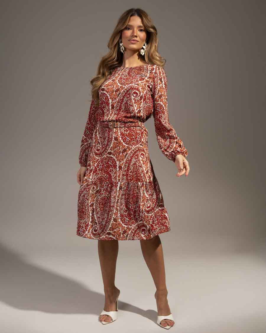 O modelo possui mangas longas levemente bufantes, cintura marcada e saia com caimento fluido, garantindo movimento.