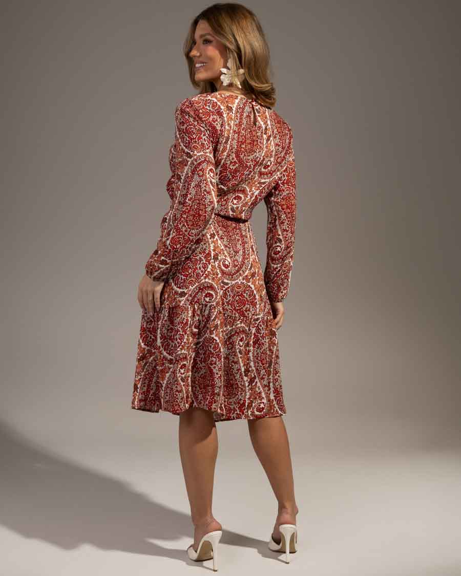 Delicado e sofisticado, este vestido em estampa é a escolha ideal para produções elegantes no dia a dia ou ocasiões especiais. Seu design valoriza a silhueta com leveza, enquanto a estampa rica em detalhes traz um visual marcante e atemporal.